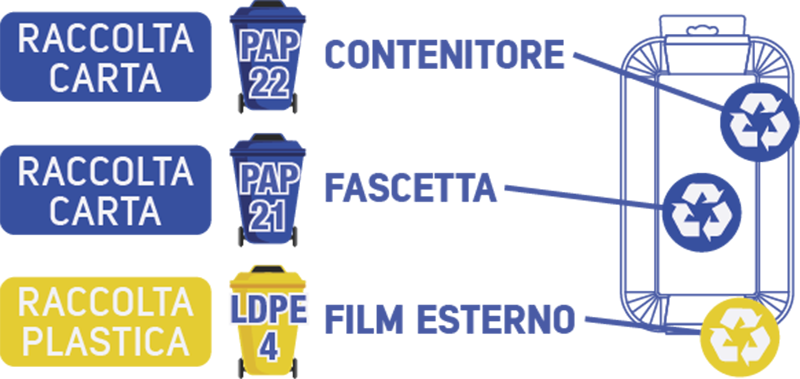 La fascetta in carta e il film in plastica che avvolgono i contenitori vanno smaltiti rispettivamente nella raccolta differenziata della carta e nella raccolta differenziata della plastica.